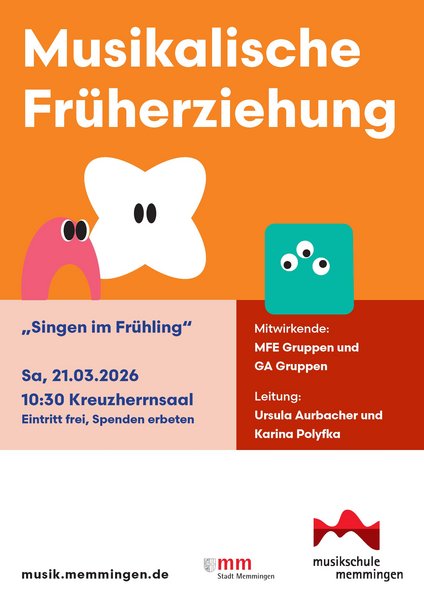 Am 21.3.26 laden die jüngsten Schülerinnen und Schüler aus der Musikalischen Früherziehung und Musikalischen Grundausbildung unter der Leitung von Ursula Aurbacher und Karina Polyfka zum „Singen im Frühling“ um 10:30 Uhr in den Kreuzherrnsaal ein.